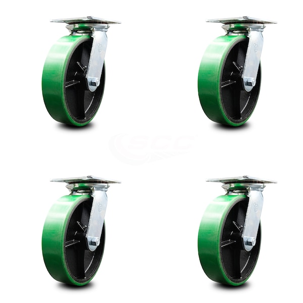 8 Inch Heavy Duty Green Poly on Cast Iron Caster Set with Roller Bearings, 4PK
