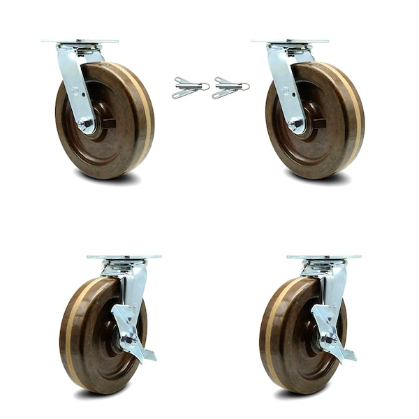 8 Inch High Temp Phenolic Caster Set with Roller Bearings 2 Swivel Lock 2 Brake