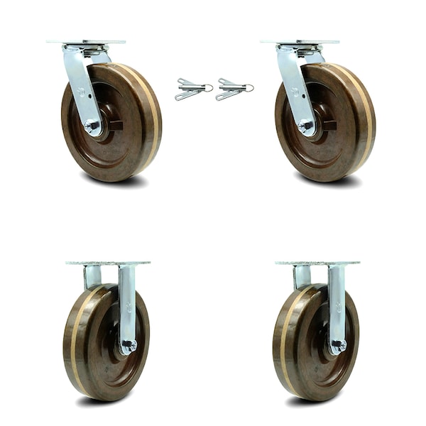 8 Inch High Temp Phenolic Caster Set with Roller Bearings 2 Swivel Lock 2 Rigid