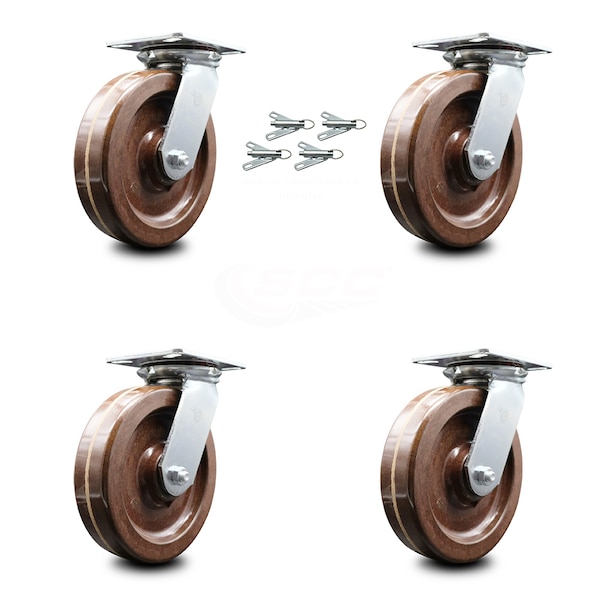 8 Inch High Temp Phenolic Caster Set with Roller Bearings and Swivel Locks SCC
