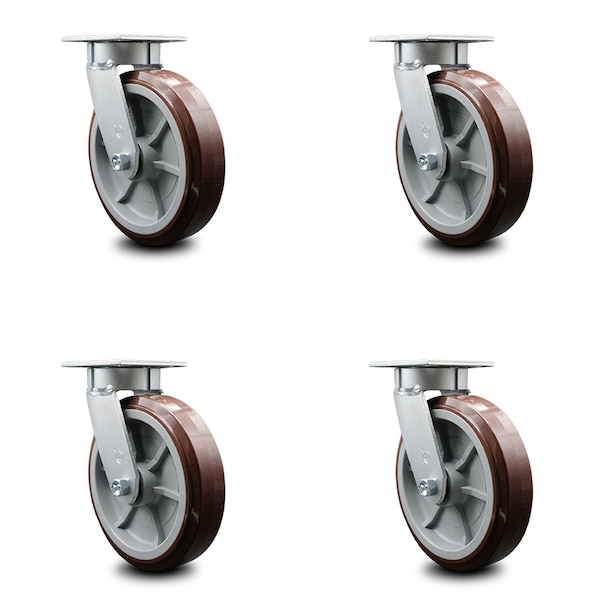 Listing is for a set of four (4) Service Caster Series #KP30 swivel casters with 8" diameter by 2" wide polyurethane on polyolefin wheels capable of supporting a total weight of 4,000 lbs. (1,000 lbs. per caster). When searching for a reliable and durable solution to your caster needs, consider Service Caster Series KP30 polyurethane wheel casters. The Service Caster Series KP30 features heavy duty non-marking polyurethane tread on a polyolefin core wheel, providing a smooth roll over uneven surfaces without marking or marring floors. Featuring a Kingpinless hot forged ASTM1045 steel design that increases caster durability and integrity, the series KP30 eliminates problems associated with kingpin failure due to severe shock loading. In addition, the Kingpinless design features 3/8” diameter HRC45 steel ball bearings which absorb thrust and load in severe environments. Lastly, Service Caster’s Series KP30 casters are finely crafted with grease fittings, and 4 position notches to accept 4-position locks. These highly versatile casters are ideal for a wide range of applications, such as dollies, platform trucks, warehouse carts and freight terminals. Even drywall carts, welding carts, and wall panel carts will be ready to roll on the Series KP30, keeping you moving forward.