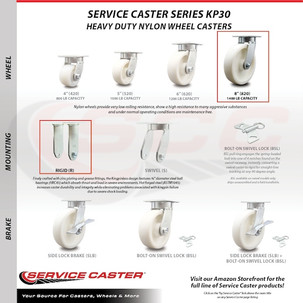 Listing is for a set of four (4) Service Caster Series #30 casters, two (2) swivel with total lock brakes and two (2) rigid casters, with 8" diameter by 2" wide nylon wheels capable of supporting a total weight of 5,000 lbs. (1,250 lbs./caster).When searching for a reliable and durable heavy duty solution to your caster needs, consider Service Caster’s Series 30 nylon wheel casters.The Service Caster Series #30 is ideal for medium and heavy duty material handling, carts, equipment, and shop projects. The zinc plated finish provides durability under any condition and the nylon wheels provide very low rolling resistance, show a high resistance to many aggressive substances and under normal operating conditions are maintenance free. Resistant to most chemical and oils, these nylon wheels will keep you safely moving forward. Service Caster is unsurpassed in quality, reliability, and excellent customer service. Count on us to move you forward.