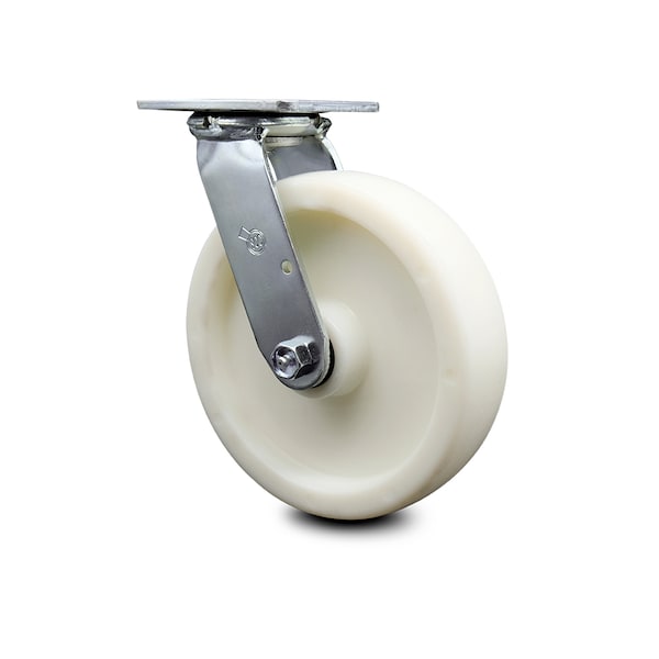 Listing is for one (1) Service Caster Series #30 swivel caster with a 8" diameter by 2" wide nylon wheel capable of supporting 1,250 lbs./caster.When searching for a reliable and durable heavy duty solution to your caster needs, consider Service Caster’s Series 30 nylon wheel casters.The Service Caster Series #30 is ideal for medium and heavy duty material handling, carts, equipment, and shop projects. The zinc plated finish provides durability under any condition and the nylon wheels provide very low rolling resistance, show a high resistance to many aggressive substances and under normal operating conditions are maintenance free. Resistant to most chemical and oils, these nylon wheels will keep you safely moving forward. Service Caster is unsurpassed in quality, reliability, and excellent customer service. Count on us to move you forward.