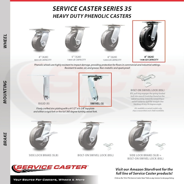 Listing is for a set of four (4) Service Caster Series #35 casters, two (2) swivel and two (2) rigid casters, with 8" diameter by 2" wide phenolic wheels capable of supporting a total weight of 5,000 lbs. (1,250 lbs./caster). When searching for a reliable and durable solution to your caster needs, consider Service Caster Series 35 phenolic wheel casters. The Service Caster Series #35 is ideal for medium and heavy duty material handling, carts, equipment, and shop projects. The zinc plated finish provides durability under any condition, and the phenolic resin wheels are highly resistant to impact damage, providing protection for floors in commercial and industrial settings. Not only are they resistant to water, oil, and grease, but because they are non-metallic, these wheels are spark proof, keeping you safely moving forward.