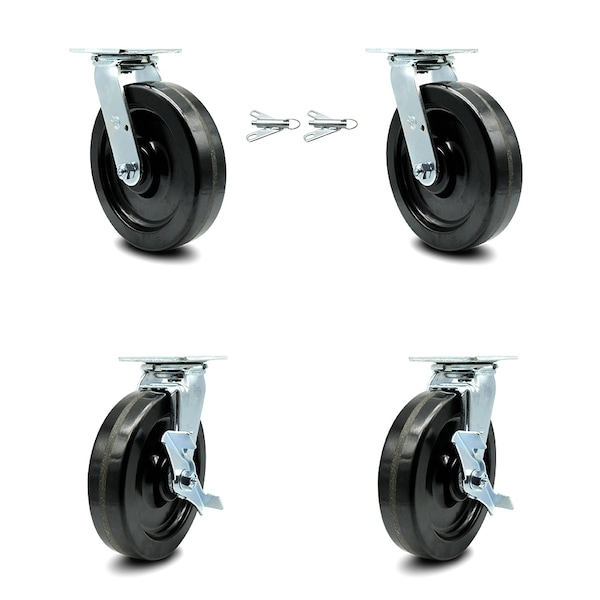 Listing is for a set of four (4) Service Caster Series #30 casters, two (2) swivel casters with bolt on swivel locks and two (2) swivel casters with side lock brakes, with 8" diameter by 2" wide phenolic wheels capable of supporting a total weight of 5,000 lbs. (1,250 lbs./caster).When searching for a reliable and durable solution to your caster needs, consider Service Caster Series 30 phenolic wheel casters. The Service Caster Series #30 is ideal for medium and heavy duty material handling, carts, equipment, and shop projects. The zinc plated finish provides durability under any condition, and the phenolic resin wheels are highly resistant to impact damage, providing protection for floors in commercial and industrial settings. Not only are they resistant to water, oil, and grease, but because they are non-metallic, these wheels are spark proof, keeping you safely moving forward. Service Caster is unsurpassed in quality, reliability, and excellent customer service. Count on us to move you forward.