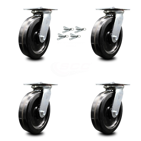 Listing is for a set of four (4) Service Caster Series #35 swivel casters with 8" diameter by 2" wide phenolic wheels with bolt on swivel locks capable of supporting a total weight of 5,000 lbs. (1,250 lbs. per caster). When searching for a reliable and durable solution to your caster needs, consider Service Caster Series 35 phenolic wheel casters. The Service Caster Series #35 is ideal for medium and heavy duty material handling, carts, equipment, and shop projects. The zinc plated finish provides durability under any condition, and the phenolic resin wheels are highly resistant to impact damage, providing protection for floors in commercial and industrial settings. Not only are they resistant to water, oil, and grease, but because they are non-metallic, these wheels are spark proof, keeping you safely moving forward.