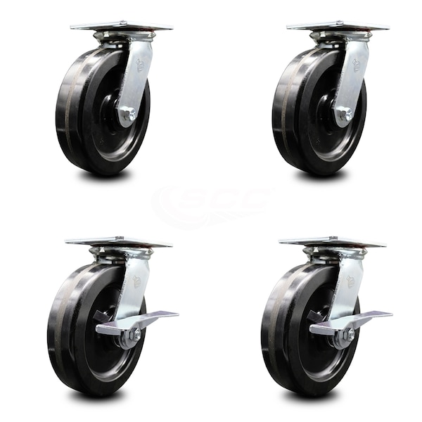 Listing is for a set of four (4) Service Caster Series #35 swivel casters, two (2) with side locking brakes, with 8" diameter by 2" wide phenolic wheels capable of supporting a total weight of 5,000 lbs. (1,250 lbs./caster). When searching for a reliable and durable solution to your caster needs, consider Service Caster Series 35 phenolic wheel casters. The Service Caster Series #35 is ideal for medium and heavy duty material handling, carts, equipment, and shop projects. The zinc plated finish provides durability under any condition, and the phenolic resin wheels are highly resistant to impact damage, providing protection for floors in commercial and industrial settings. Not only are they resistant to water, oil, and grease, but because they are non-metallic, these wheels are spark proof, keeping you safely moving forward.