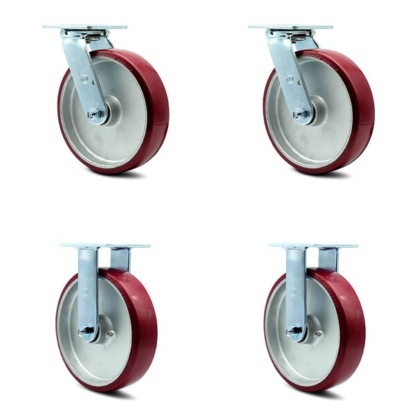 Listing is for a set of four (4) Service Caster Series #30 casters, two (2) swivel and two (2) rigid casters, with 8" diameter by 2" wide maroon polyurethane tread on silver aluminum core wheels capable of supporting a total weight of 5,000 lbs. (1,250 lbs. per caster).When searching for a reliable and durable solution to your caster needs, rely on Service Caster Series 30 polyurethane aluminum wheel casters. The Series #30 features heavy duty polyurethane wheels that are chemically bonded to an aluminum core, providing a smooth roll over uneven surfaces without marking or marring floors. Finely crafted with a bright zinc plated finish and heat-treated ball bearing raceway, these versatile casters are ideal for a wide range of applications. Use on dollies, platform trucks, warehouse carts and freight terminals, or ensure a smooth and secure ride for food service carts, hotel housekeeping carts, and industrial and commercial equipment. Even drywall carts, welding carts, and wall panel carts will be ready to roll on the Series 30, keeping you moving forward. Service Caster is unsurpassed in quality, reliability, and excellent customer service. Count on us to move you forward.