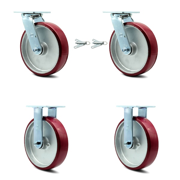 Listing is for a set of four (4) Service Caster Series #30 casters, two (2) swivel casters with bolt on swivel locks and two (2) rigid casters, with 8" diameter by 2" wide polyurethane on aluminum wheels capable of supporting a total weight of 5,000 lbs. (1,250 lbs./caster).When searching for a reliable and durable solution to your caster needs, rely on Service Caster Series 30 polyurethane aluminum wheel casters. The Series #30 features heavy duty polyurethane wheels that are chemically bonded to an aluminum core, providing a smooth roll over uneven surfaces without marking or marring floors. Finely crafted with a bright zinc plated finish and heat-treated ball bearing raceway, these versatile casters are ideal for a wide range of applications. Use on dollies, platform trucks, warehouse carts and freight terminals, or ensure a smooth and secure ride for food service carts, hotel housekeeping carts, and industrial and commercial equipment. Even drywall carts, welding carts, and wall panel carts will be ready to roll on the Series 30, keeping you moving forward. Service Caster is unsurpassed in quality, reliability, and excellent customer service. Count on us to move you forward.