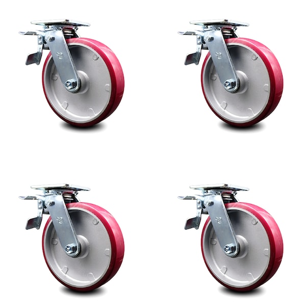 Listing is for a set of four (4) Service Caster Series #30 swivel casters with 8" diameter by 2" wide polyurethane on aluminum wheels with total lock brakes capable of supporting a total weight of 5,000 lbs. (1,250 lbs. per caster). When searching for a reliable and durable solution to your caster needs, rely on Service Caster Series 30 polyurethane aluminum wheel casters. The Series #30 features heavy duty polyurethane wheels that are chemically bonded to an aluminum core, providing a smooth roll over uneven surfaces without marking or marring floors. Finely crafted with a bright zinc plated finish and heat-treated ball bearing raceway, these versatile casters are ideal for a wide range of applications. Use on dollies, platform trucks, warehouse carts and freight terminals, or ensure a smooth and secure ride for food service carts, hotel housekeeping carts, and industrial and commercial equipment. Even drywall carts, welding carts, and wall panel carts will be ready to roll on the Series 30, keeping you moving forward. Service Caster is unsurpassed in quality, reliability, and excellent customer service. Count on us to move you forward.