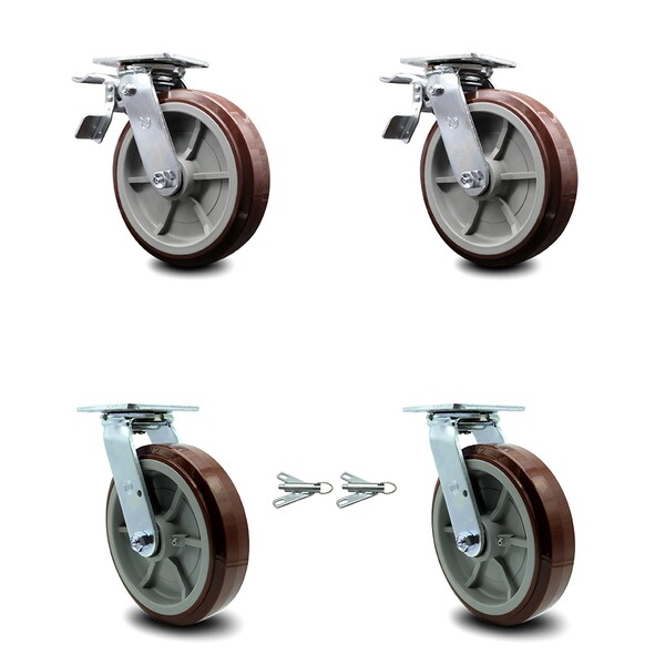 8 Inch Polyurethane Caster Set with Roller Bearings 2 Brakes 2 Swivel Locks SCC