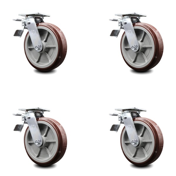 8 Inch Polyurethane Caster Set with Roller Bearings and Total Lock Brakes SCC