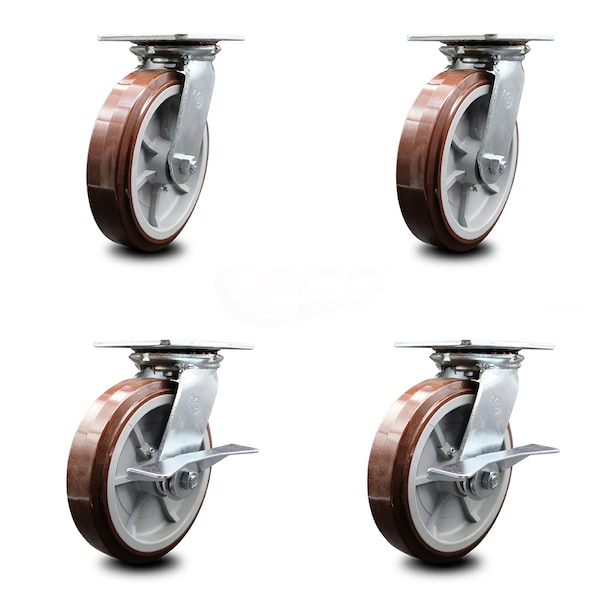 Listing is for a set of four (4) Service Caster Series #35 swivel casters, two (2) with side locking brakes, with 8" diameter by 2" wide polyurethane on polyolefin wheels and maintenance free precision ball wheel bearings. Capable of supporting a total weight of 4,000 lbs. (1,000 lbs./caster). When searching for a reliable and durable solution to your caster needs, consider Service Caster Series 35 polyurethane wheel casters. The Service Caster Series #35 features heavy duty non-marking polyurethane tread on a polyolefin core wheel, providing a smooth roll over uneven surfaces without marking or marring floors. These versatile casters are ideal for a wide range of applications, such as dollies, platform trucks, warehouse carts and freight terminals. Or ensure a smooth and secure ride for food service carts, hotel housekeeping carts, and industrial and commercial equipment. Even drywall carts, welding carts, and wall panel carts will be ready to roll on the Series 35, keeping you moving forward.