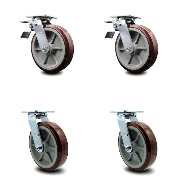 8 Inch Polyurethane Swivel Caster Set with Roller Bearing 2 Total Lock Brake SCC