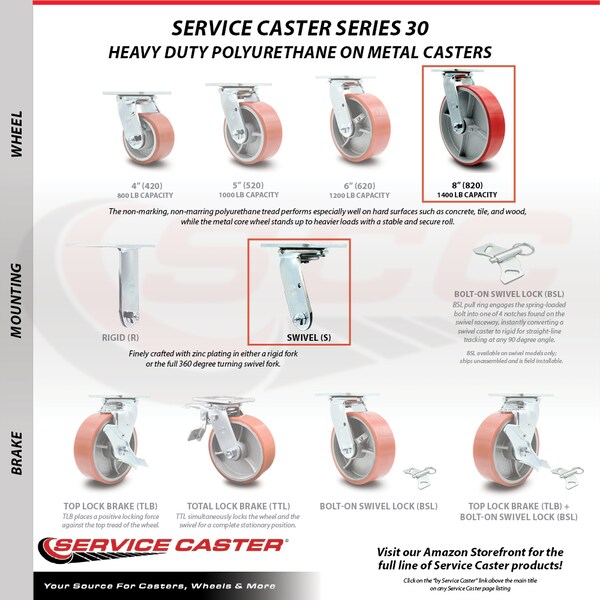 Listing is for a set of four (4) Service Caster Series #30 casters with a 8" diameter, 2" wide red polyurethane tread set on metal core wheels. Set includes two (2) swivel casters and two (2) rigid casters. Supports 5000 total pounds (lbs) at 1250 pounds (lbs) per caster. Non Marking/Non Marring.When searching for a reliable and durable solution for medium and heavy duty projects, consider Service Caster’s Series 30 top plate polyurethane casters. The Service Caster Series #30 is ideal for material handling, carts, equipment, and shop projects. The non-marking, non-marring polyurethane tread performs especially well on hard surfaces such as concrete, tile, and wood, while the metal core wheel stands up to heavier loads with a stable and secure roll. Finely crafted with double ball bearing heat treated raceways, these versatile casters are ideal for a wide range of applications, such as dollies, platform trucks, warehouse carts and freight terminals. Or ensure a smooth and secure ride for food service carts, hotel housekeeping carts, and industrial and commercial equipment. Even drywall carts, welding carts, and wall panel carts will be ready to roll on the Series 30, keeping you moving forward. Service Caster is unsurpassed in quality, reliability, and excellent customer service. Count on us to move you forward.