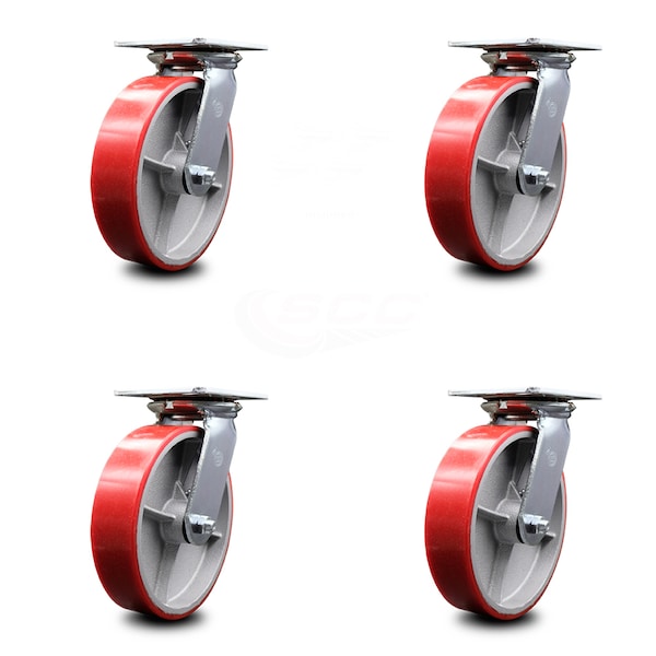 8 Inch Red Poly on Cast Iron Caster Set with Roller Bearings and Swivel Locks