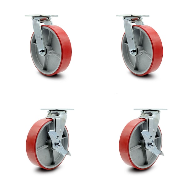 8 Inch Red Poly on Cast Iron Swivel Caster Set with Ball Bearings 2 Brakes SCC