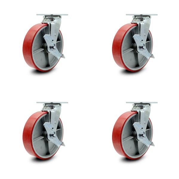 8 Inch Red Poly on Cast Iron Swivel Caster Set with Roller Bearings and Brakes