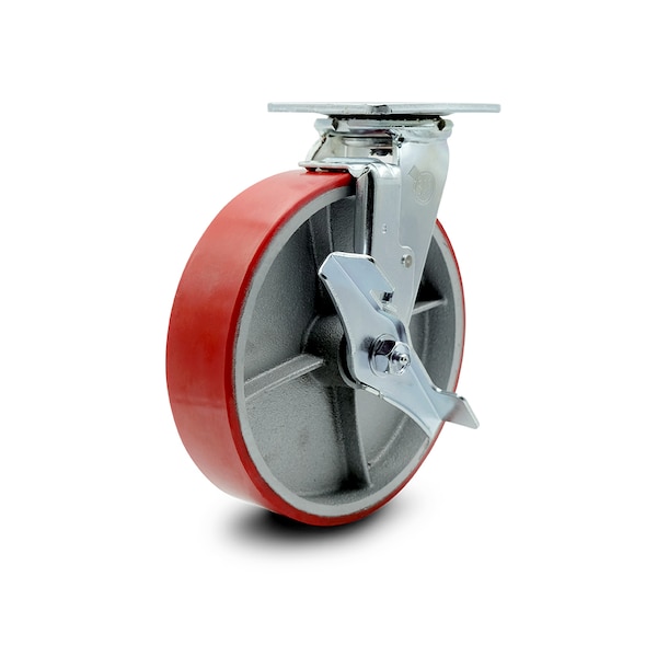 8 Inch Red Poly on Cast Iron Swivel Caster with Roller Bearing and Brake SCC