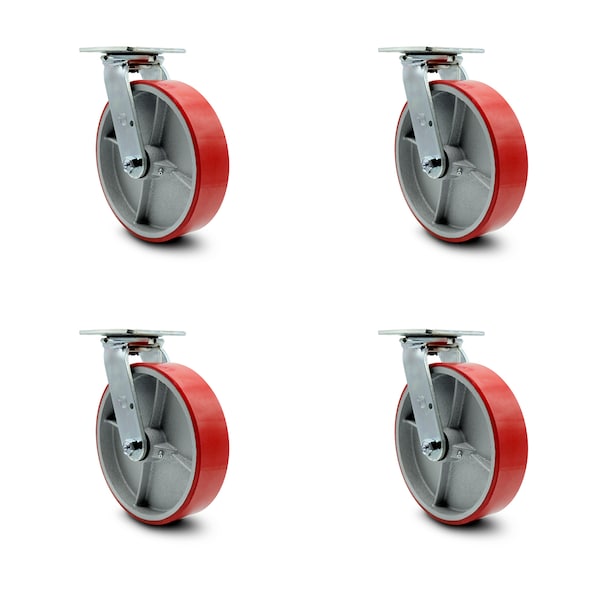 Listing is for a set of four (4) Service Caster Series #30 swivel casters with 8" diameter by 2" wide red polyurethane on cast iron wheel and maintenance free precision ball wheel bearings capable of supporting a total weight of 5,000 lbs. (1,250 lbs. per caster). When searching for a reliable and durable solution for medium and heavy duty projects, consider Service Caster’s Series 30 top plate polyurethane casters. The Service Caster Series #30 is ideal for material handling, carts, equipment, and shop projects. The non-marking, non-marring polyurethane tread performs especially well on hard surfaces such as concrete, tile, and wood, while the metal core wheel stands up to heavier loads with a stable and secure roll. Finely crafted with double ball bearing heat treated raceways, these versatile casters are ideal for a wide range of applications, such as dollies, platform trucks, warehouse carts and freight terminals. Or ensure a smooth and secure ride for food service carts, hotel housekeeping carts, and industrial and commercial equipment. Even drywall carts, welding carts, and wall panel carts will be ready to roll on the Series 30, keeping you moving forward. Service Caster is unsurpassed in quality, reliability, and excellent customer service. Count on us to move you forward.