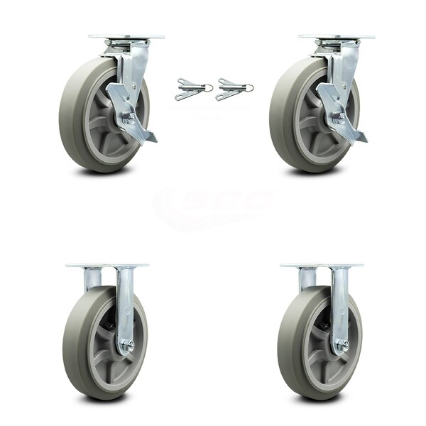 8 Inch Thermoplastic Rubber Caster Set with 2 Brakes/Swivel Lock 2 Rigid SCC