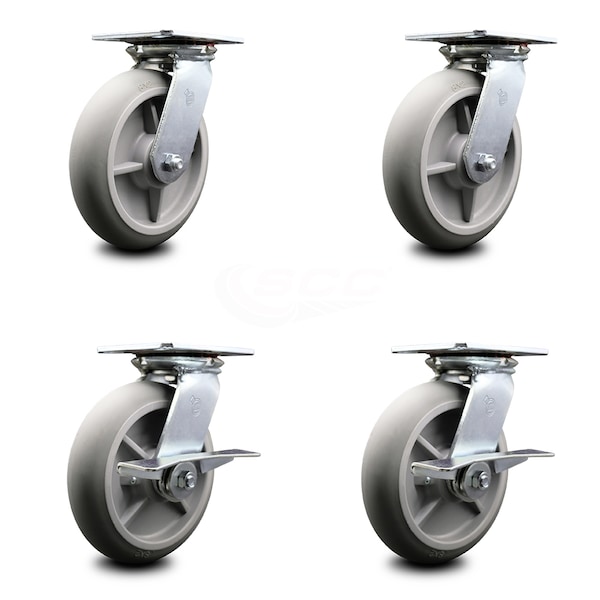 8 Inch Thermoplastic Rubber Swivel Caster Set with Roller Bearings 2 Brakes SCC