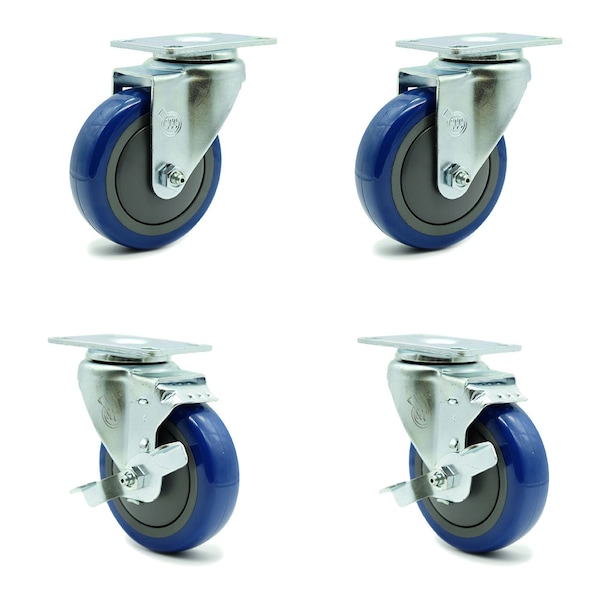 High quality casters for Regency U-Boat utility carts. Listing is for a set of four (4) Service Caster Series #20 swivel casters and 4 inch diameter by 1-1/4 inch wide blue polyurethane tread on gray polyolefin core wheels. Set includes two (2) swivel casters and two (2) swivel casters with brakes. These Regency replacement casters are non-marking and non-marring. Supports 1,200 total pounds (lbs.) at 300 pounds (lbs.) per caster. When searching for a reliable and durable solution to your Regency Utility Cart replacement caster needs, consider Service Caster Series 20 top plate polyurethane tread on polyolefin core wheel casters. The Service Caster Series #20 features polyurethane tread on polyolefin core wheels that offer a softer tread for smoother travel while also resisting damage from debris. Finely crafted with a bright zinc plated finish and heat-treated ball bearing raceway, these Service Caster high performance Regency Utility Cart replacement casters balance high pay loads with smooth and quiet operation. These versatile casters are ideal for a wide range of applications, but are commonly used on Regency Utility Carts. Service Caster is unsurpassed in quality, reliability, and excellent customer service. Count on us to move you forward.