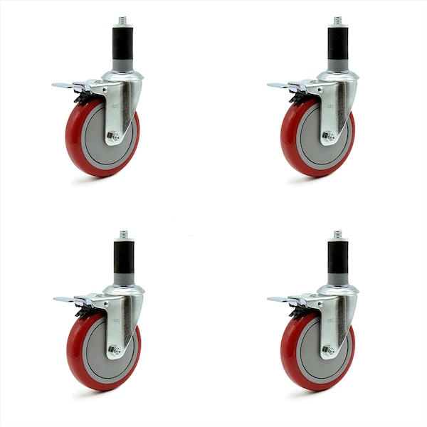 High quality casters for all Regency Work Tables and Equipment Stands. Listing is for a set of four (4) Service Caster Series #20 swivel casters with total lock brakes and 5 inch diameter by 1-1/4 inch red polyurethane tread on gray polyolefin core wheels. These Regency Work Table and Equipment Stand replacement casters have 1-1/2 inch expanding adapter stems and work great on any Regency Work Table and Equipment Stand. Supports 1,200 total pounds (lbs.) at 300 pounds (lbs.) per caster. When searching for a reliable and durable solution to your Regency Work Tables and Equipment Stands replacement caster needs, consider Service Caster Series 20 expanding adapter stem polyurethane tread on polyolefin core wheel casters. The Service Caster Series #20 features polyurethane tread on polyolefin core wheels that offer a softer tread for smoother travel while also resisting damage from debris. Finely crafted with a bright zinc plated finish and heat-treated ball bearing raceway, these Service Caster high performance Regency replacement casters balance high pay loads with smooth and quiet operation. These versatile casters are ideal for a wide range of applications, but are commonly used on Regency Work Tables and Equipment Stands. Service Caster is unsurpassed in quality, reliability, and excellent customer service. Count on us to move you forward.