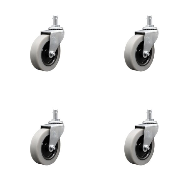 Listing is for a set of four 4 Service Caster Series #05 swivel casters with 3'' diameter thermoplastic rubber wheels and 7/16'' diameter x 1-7/8'' length grip ring stems. Supports up to 110 lbs. per caster or 440 lbs. total. Replacement part fits Rubbermaid Audio-Visual Cart FG9T2800BLA and FG9T2900BLA. When searching for a reliable and durable solution to your Rubbermaid Audio-Visual Cart needs, consider Service Caster's Series 05 thermoplastic rubber casters. The Service Caster 05 series are ideal for light duty applications, and are the perfect solution as new or replacement parts for Rubbermaid Audio-Visual Carts, tables, medical carts and other home and office furniture. This durable caster provides easy maneuverability for a smooth and quiet ride, and features dual ball bearing heat treated raceway construction, with a zinc plated finish that provides durability under any condition. Wheels are available in non-marking thermoplastic rubber which is excellent for concrete and tile floor surfaces. Service Caster is unsurpassed in quality, reliability, and excellent customer service. Count on us to move you forward.