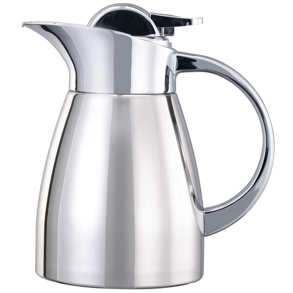 Enhanced with a high polished finish and chome-painted plastic lid and handle to give the Elite Stainless Touch push button carafe a high-end feel. Great for fine dining and room service. Features an unbreakable stainless liner with vacuum insulation that retains hot or cold temperatures for 4-6 hours. Its newly designed, stay-clean lid allows liquid to pour under it, not through it, creating a more sanitary server.