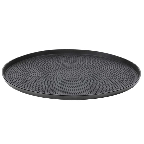 The Modern Edge Removable Insert Tray - a stylish and versatile serving solution designed for commercial foodservice settings - is crafted to elevate your dining experience. Its sleek, lower profile, paired with a smaller outer diameter, makes it perfect for space-saving in buffet displays. The textured rubber insert adds a layer of adaptability, providing a non-slip surface to prevent glasses and plates from sliding during service. For a touch of sophistication, remove the insert for an elegant appetizer plate presentation.In addition to their aesthetic appeal, these trays offer organizational efficiency with stackability, ensuring a tidy storage solution. Precision-crafted from 18/8 stainless steel a black silicone rubber, they blend durability with functionality. in