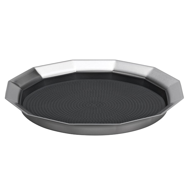 The Non-Slip Round Tray is a great serving tool for bars and restaurants. Its removable rubber insert allows for versatility. Add the insert to create a non-slip surface that keeps glasses and plates from sliding during service, or take it out and replace with a doily for an appetizer plate presentation. Trays are stackable for neat and organized storage. Constructed from 18/8 stainless steel and black silicone rubber. Outer diameter 11 ; Inner diameter 9. Dishwasher safe