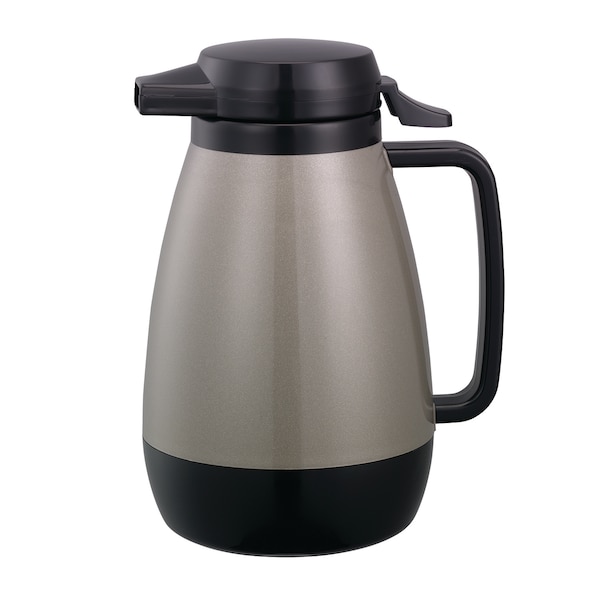 The Thermo-Serv Push-Button Server is a classically designed carafe that features a durable ABS plastic shell with double-wall foam insulation and a safety push button lid, ideal for serving hot coffee and water at the perfect temperature for 2-3 hours. Sonic welded seams create an ultra-smooth body and metallic flakes give the black finish a touch of sparkle. Service staff will appreciate the quick quarter-turn installation and removal of the lid. BPA free and dishwasher safe