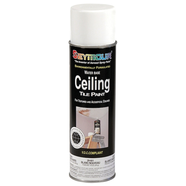 This is a water based paint that covers up and restores stained ceiling tiles to look brand new again. For use on textured and acoustical ceiling tiles. It is fast drying, sprays upright, and will not warp or sag tiles. For easiest application on high ceilings, use Seymour’s Spray Wand #Z-606 that is 33 inches long