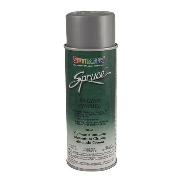 Spruce Eng. Paint,chrome Alum,12oz., Opacity 100 Percent, Maximum Dry Film Thickness 1.5 mil, Coating Application Heat-Resistant Engine Enamel, Color Family Aluminum/Metallic, Compatible Surface Material Metal, Sheen High-Gloss, Finish Texture Smooth, Resin Type V.T. Alkyd, Color Chrome Aluminum, Container Size 16 fl oz, Coverage Area 15 sq ft, Base Type Solvent, Dry Time 5 min, Use Location Exterior, Sub Brand SPRUCE(R), Container Type Aerosol Can, Dry Time Tack Free 5 min