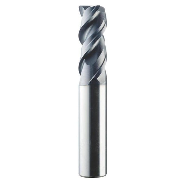 SGS End Mill, Center Cutting High Performance Positive Rake Regular Length Single End, Series: 33CR, 1/2 in Diameter Cutter, 0.03 in Corner Radius, 3-1/4 in Overall Length, 1-1/4 in Length of Cut, 3 Flutes, Right Spiral Flute, 1/2 in Shank Diameter, Right Hand Cutting Direction, 32 to 48 deg Helix Angle, Straight Shank, 2 in Shank Length, Solid Carbide, AlTiN Coated
