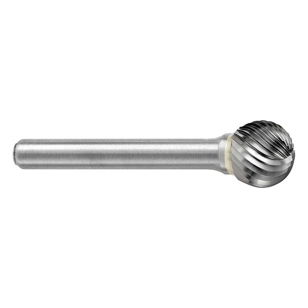 Carbide Bur, End Type Radius, Cut Type Single, Shank Dia. 1/4 in, Head Dia. 7/16 in, Head Length 3/8 in, Included Angle Not Applicable, Overall Length 2 1/8 in, Trade Number SD-4, Primary Material Application Brass, Bronze, Copper, Ferrous Metals, Nickel, Titanium, Head Shape Ball, Operating Speed - Maximum 28,000 RPM, System of Measurement Inch, Coating Bright (Uncoated), Head Material Carbide, Shank Material Steel