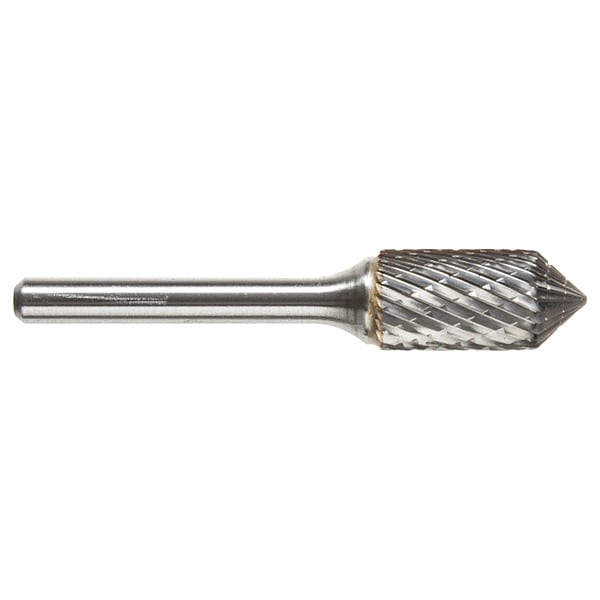 Carbide Bur, End Type Pointed, Cut Type Double, Shank Dia. 1/4 in, Head Dia. 1/2 in, Head Length 1 in, Included Angle 90 Degrees , Overall Length 2 3/4 in, Trade Number SKA-5CO, Primary Material Application Ferrous Metals, Non-Ferrous Metals, Head Shape Cone, Cylinder, Operating Speed - Maximum 28,000 RPM, System of Measurement Inch, Coating Bright (Uncoated), Head Material Carbide, Shank Material Steel