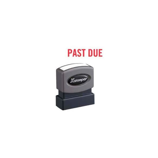Xstamper pre-inked message stamp, past due, 1-5/8" x 1/2", red red ink past due title stamp is pre-inked for 100,000 impressions and re-inkable for 100,000 more, again and again. Patented cellular inking process delivers clean, consistent impressions. Retractable frame keeps stamp surface away from desktop until ready to use. Impression size is 1/2" x 1-5/8". Pre-inked stamp contains a high percentage of recycled material.