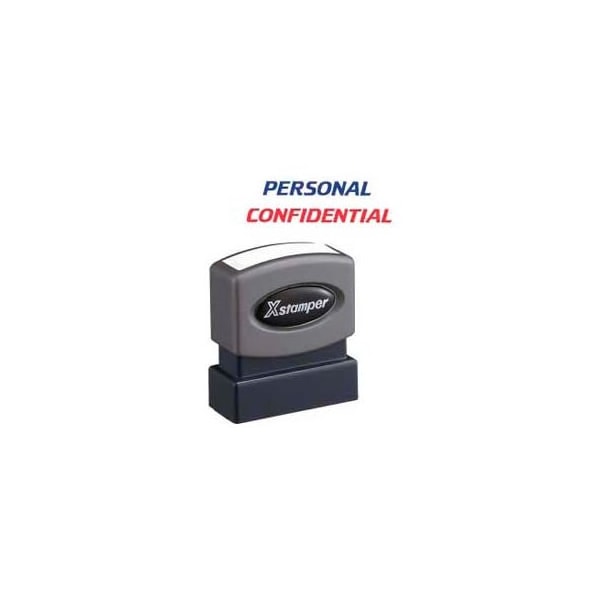 Xstamper pre-inked message stamp, personal/confidential, 1-5/8" x 1/2", blue/red personal/confidential title stamp prints two colors simultaneously and is pre-inked for 100,000 impressions. Each re-inking provides another 100,000 impressions. Patented cellular inking process delivers clean, consistent impressions. Impression size is 1/2" x 1-5/8". Spring-activated, retractable stamping surface keeps work area clean. Pre-inked stamp is made from high-impact polymers for years of trouble-free use and contains a high percentage of recycled material.