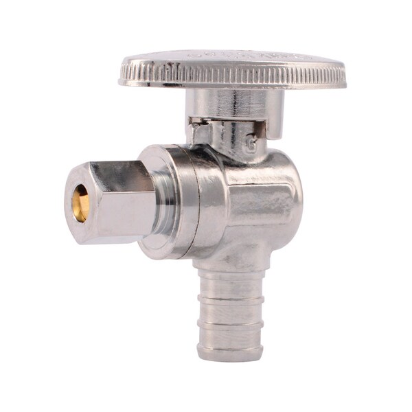 The SharkBite 1/2 in. Barb x 1/4 in. O.D. Compression Angle Stop Quarter-Turn Valve controls water flow to household plumbing fixtures. The Angle Stop Valve is used where the water pipe enters the room to allow for easy shut-off of water flow to the end fixture allowing for maintenance and repair without having to turn water off to the entire home. The SharkBite 1/4 in. Barb End can be connected to PEX Pipe using Copper Crimp Rings or Stainless Steel Clamps. The 1/4 in. Compression Outlet with the supplied ferrule and compression nut, can be used with 1/4 in. O.D. Pipe or 1/4 in. Supply Line. This valve is best suited for use on Icemakers, Humidifiers, Water Filtration Systems, Coffee Makers, and Swamp/Evaporative Coolers.