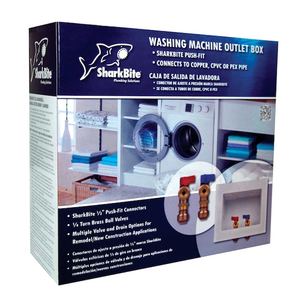 The SharkBite washing machine outlet box is integrated with SharkBite ends to allow for quick and easy installation in residential laundry spaces using Copper, PEX, CPVC or PE-RT water lines. It provides quick and safe water supply/shutoff for washing machines. This product is offered with or without integral water hammer arrestors for water shockwave prevention. The box allows for easy valve access and operation and can be mounted to the left or right of the stud bay and needs no additional support framing. It can be used as a dual drain or inverted for center drain applications as well.