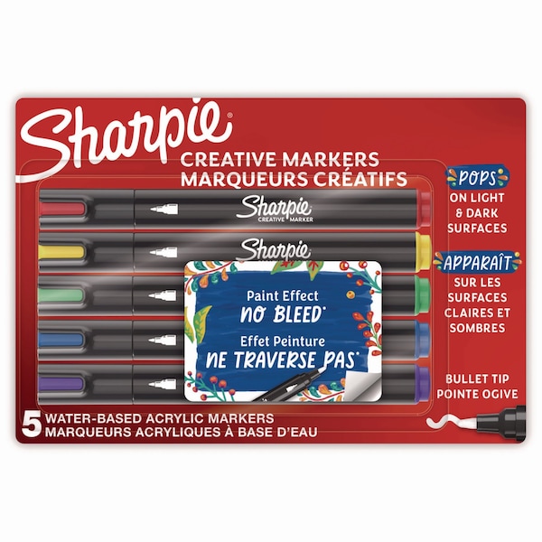 Bring your artistic vision to life with Sharpie Creative Markers! These acrylic markers feature stunning paint-like ink that glides across the page with the control of a marker. The water-based ink won't bleed through paper, so your work stays clean. The bright color markers create vibrant marks on light and dark surfaces and boldly mark on paper, metal, wood, ceramic, glass, rock and canvas. The colors beautifully layer to add dimension to your work. What's more, there's no need to prime these brush tip markers-simply uncap and go!