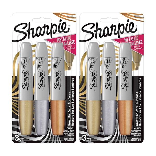 Get your shine on with Sharpie Metallic Permanent Markers. With a versatile chisel tip, create fine lines and thick marks with major style. Stand out in a crowd by using these metallic permanent markers for hand-lettering, coloring, labeling, and crafting. Each permanent marker is made with specially formulated ink designed to be quick-drying and fade- and water-resistant. Every mark boldly stands out on light and dark surfaces, meaning they're perfect for projects on a black background. Each pack includes 3 markers. Sold as 2 packs for a total of 6 markers.