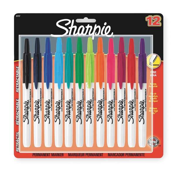 Permanent Marker Set, Assorted, Aqua, Berry, Black, Blue, Green, Lime, Magenta, Navy, Orange, Purple, Red, Turquoise, Marker Tip Fine, Marker Cap Retractable, Barrel Type Standard, Washable Non-Washable, Waterproof Water-Resistant, Standards ACMI AP, ASTM D-4236, Markers Brand SHARPIE, Package Quantity 12