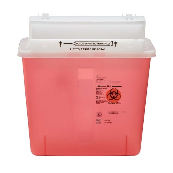 Sharps Container SharpStar In-Room Translucent Red Base 12-1/2 H X 5-1/2 D X 10-3/4 W Inch Horizontal Entry 1.25 Gallon Minimizes the possibility of overfilling by stopping in the ''full'' position when it reaches maximum capacity, also allows visual monitoring The SharpStar container is the only sharps disposal container awarded the Seal of Acceptance from the Alliance of Children's Hospitals Inc The SharpStar System is ideal for pediatric, geriatric or high risk areas 12-1/2 inches high x 5-1/2 inches deep x 10-3/4 inches wide