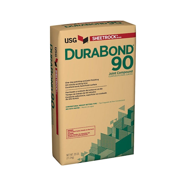 USG Sheetrock Brand Durabond 90 Joint Compound is a setting-type compound that provides faster finishing of drywall interiors, even under slow drying conditions. Rapid chemical hardening and low shrinkage permit same-day finishing and usually next-day decoration. It features exceptional bond, virtually unaffected by humidity extremes, and is are ideal for laminating double-layer systems, particularly fire-rated assemblies, and for adhering gypsum panels to above-grade concrete surfaces. May also be used for surface texturing and for filling, smoothing and finishing interior above-grade concrete. Note: Setting-type joint compounds should not be used for skim coating due to dryout concerns.