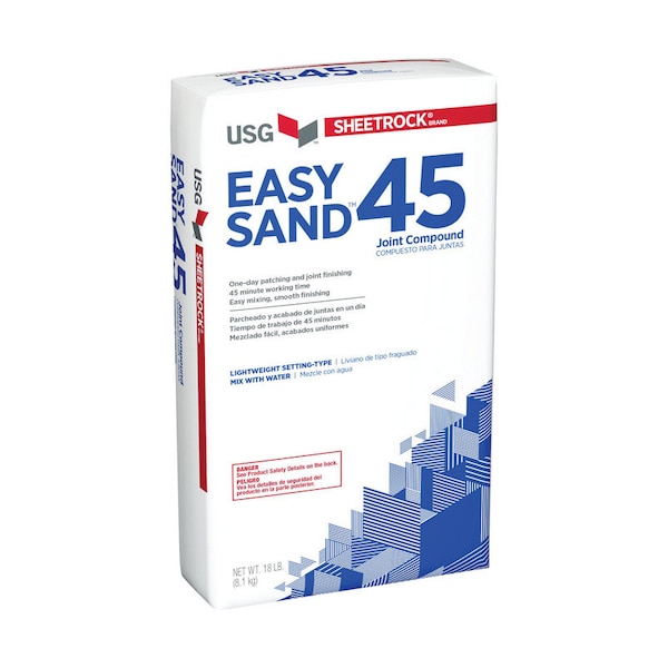 USG Sheetrock Brand Easy Sand 45 Joint Compound is a lightweight, setting-type compound with a 45-minute working time. USG setting-type joint compounds provide faster finishing of drywall interiors, even under slow drying conditions. Rapid chemical hardening and low shrinkage permit same-day finishing and usually next-day decoration. USG Sheetrock Brand Easy Sand 45 Joint Compound features an exceptional bond; virtually unaffected by humidity extremes. It is ideal for laminating double-layer systems, particularly fire-rated assemblies, and for adhering gypsum panels to above-grade concrete surfaces. May also be used for surface texturing and for filling, smoothing and finishing interior above-grade concrete. Note: Setting-type joint compounds should not be used for skim coating due to dryout concerns.