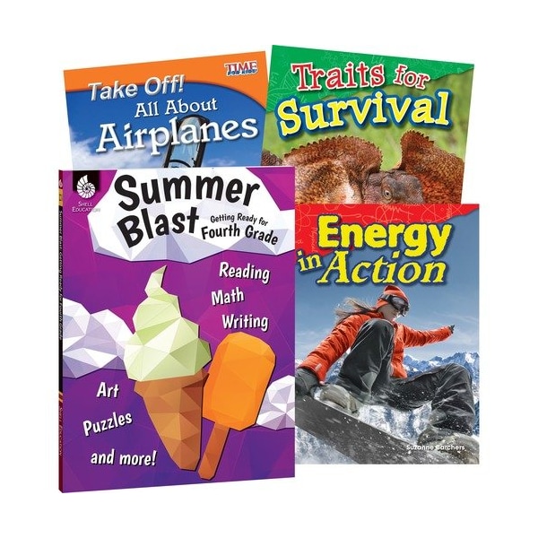 STEM book set features focused readers and activity sheets to help young learners reinforce and develop important skills. The bundle comes with daily practice sheets that cover science, technology, engineering and math topics. Diverse activities are aligned to national and state standards. Individual readers discuss concepts in a fun way to keep children engaged. Text features, such as bold print, captions, index and a glossary, increase comprehension. Book set is perfect for building skills and preventing summer learning loss. Book set with digital resources includes Take Off! All About Airplanes, Traits for Survival, Energy in Action, and Getting Ready for Fourth Grade.