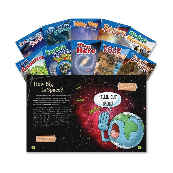 Let your students learn and explore earth and space science with this 10-book set. Organized sections teach students about the makeup of the earth, including the rock cycle, natural resources, the ocean, the Milky Way and global warming. Vibrant images are paired with easy-to-read text to keep students engaged from cover to cover. Titles include Earth's Cycles, We Are Here, The Rock Cycle, Our Resources, The Story of Fossil Fuels, The Four Spheres of Earth, The Powerful Ocean, The Milky Way: A River of Stars, Stars, Global Warming. Set is designed for fourth-graders and fifth-graders.